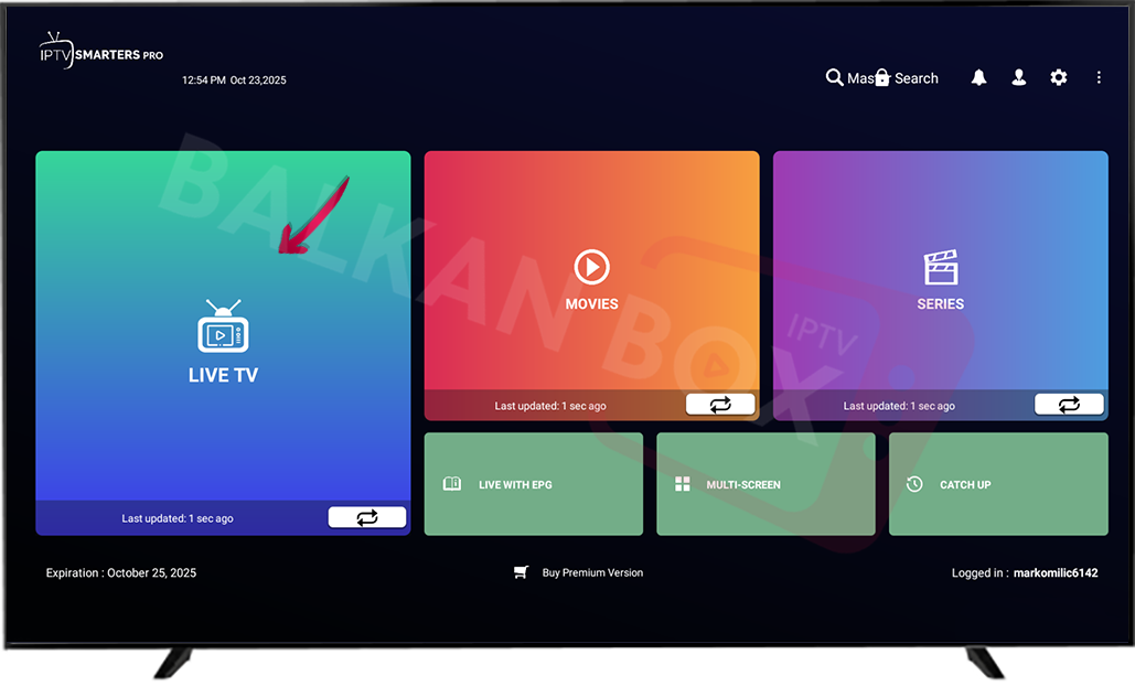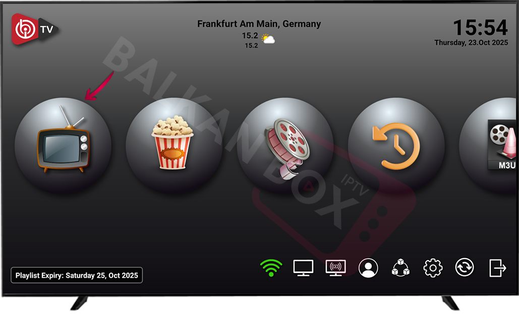 • Na TV-u ponovo pokrenite IBO Player i u meniju izaberite TV (Live TV) da učitate kanale.