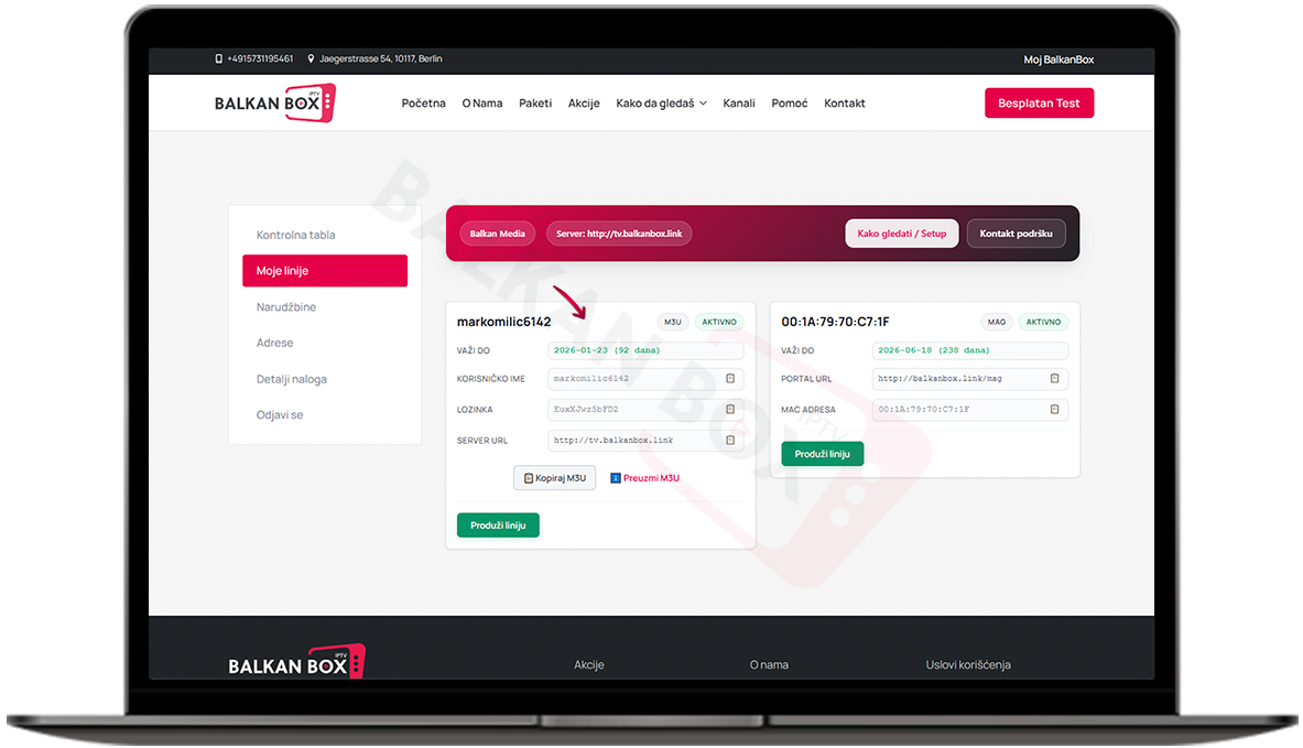 • Tu se nalaze korisničko ime, lozinka i server URL koje ćete uneti u aplikaciju IPTV Smarters Pro.