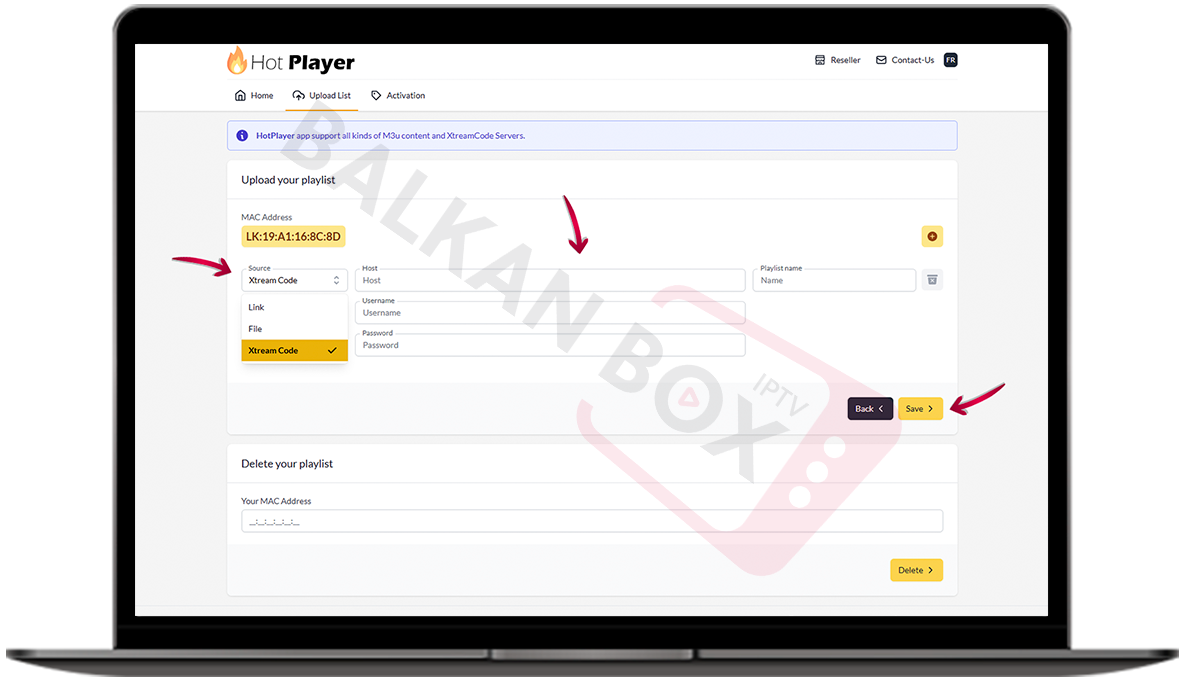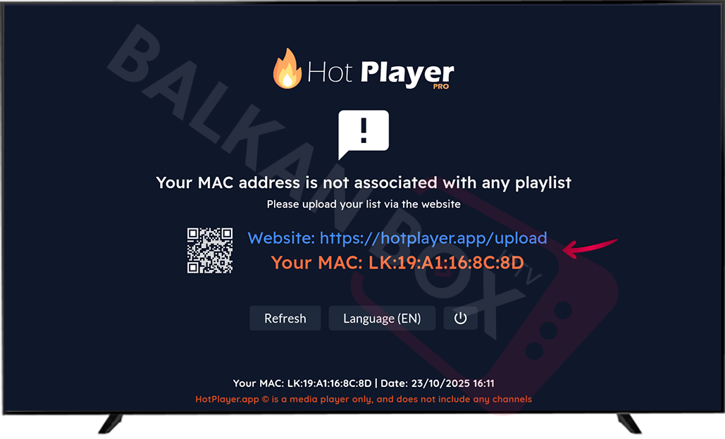 • Na ekranu će se prikazati vaša MAC adresa i link za upload: hotplayer.app/upload.