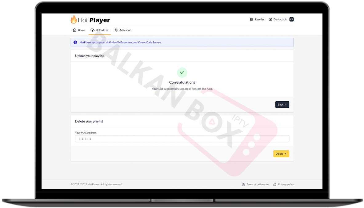 • Vaša lista je uspešno dodata – sada restartujte Hot Player na TV-u.